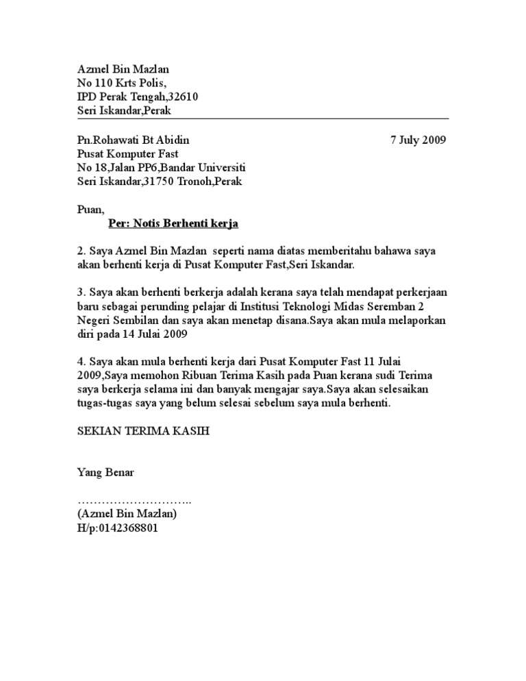 Contoh Surat Berhenti Kerja 2 Minggu Pdf - Contoh Surat Resign Dalam Bahasa Inggris - Contoh Wolu - Setelah membuat surat lamaran kerja jangan lupa untuk juga membuat daftar riwayat hidup (cv) guna untuk melengkapi syarat melamar pekerjaan.. When searching, be sure it searches all hidden files and folders in xp check advanced search settings final cut pro 7 serial number autodesk 3ds max 2012 product update 12 easy video recordings playback hkey current user software microsoft internet. Berikut contoh surat lamaran pekerjaan terbaru 2019 resmi yang baik dan benar dengan format formal yang bisa anda unduh untuk melamar di perusahaan bumn. So please help us by uploading 1 new document or like us to download Contoh surat berhenti kerja bahasa melayu picture places. Kita perlu melakukan pemberitahuan terlebih dahulu sebelum memutuskan untuk berhenti bekerja.